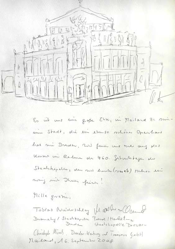 Il 16 settembre 2008 lo staff della Staatskapelle di Dresda – una delle più antiche Orchestre del mondo – ha lasciato in “dono” questo ringraziamento agli Amici della Scala, a margine di un bellissimo schizzo della famosa facciata del Teatro che domina la piazza principale della storica Città.