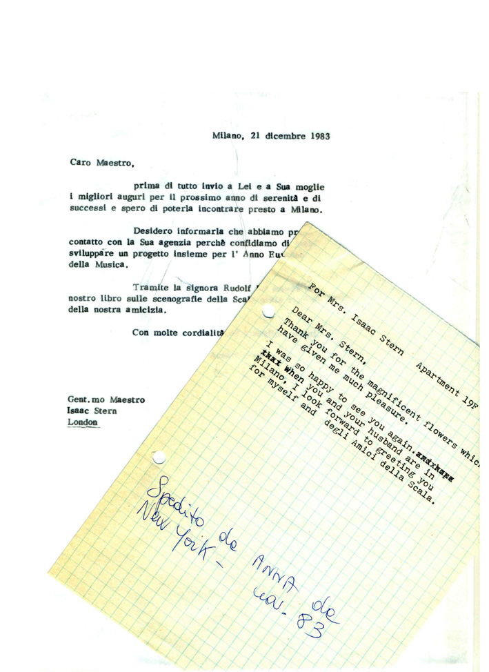 Due lettere inviate ai coniugi Stern. Il sommo violinista, Isaac Stern, uno dei più grandi interpreti del ’900, è stato nominato Socio onorario degli Amici della Scala.