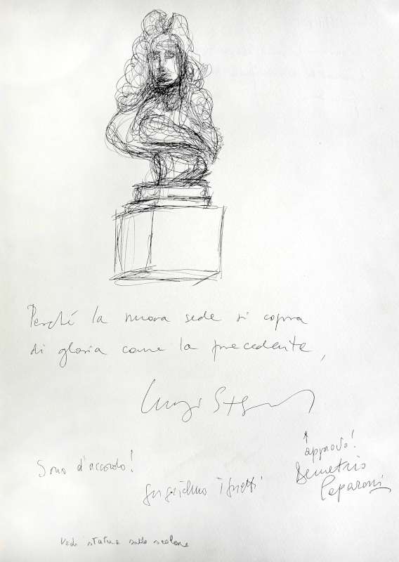 Cartoonist, director and scenographer, Sergio Staino left a sketch in the guestbook as a “gift” to the Association. The sketch depicts the statue that welcomes the visitors at the entrance of our via dei Giardini offices, and includes a note in which Staino wishes that our new premises “will be as gloriously blessed as the previous ones”.